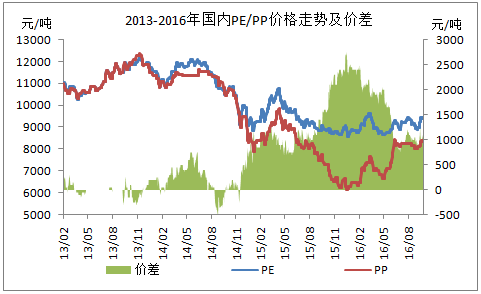 总体看来,在国内聚丙烯产能、产量、自给率均超过聚乙烯时,聚丙烯的同质化竞争更加显著,其价钱与PE差价慢慢扩张,2013-2014年,PE-PP流行差价在0-400元/吨,而 2015年至今,PE-PP流行差价扩张至700-2000元/吨。充分考虑将来聚丙烯产能仍保持较快提高,预估将来PE-PP差价仍将再次扩张。