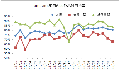 中国聚丙烯产量较聚乙烯提高更加显著,聚丙烯总体自给率亦高些,现阶段中国聚丙烯各种类自给率达74%-86%,截至9月份,均聚自给率80.34%,同比增长率4.61%;嵌段共聚物自给率74.09%,同比增长率4.70%;别的共聚物自给率85.46%,环比略降0.13%。