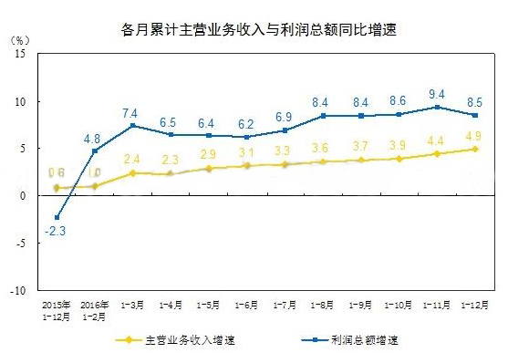据中国统计局工业生产司何平博士讲解表明,2016年,中国规模以上工业企业利润比去年提高8.5%,增长速度比1-11月份下降0.9个点,12月份利润同比增长2.3%,增长速度比11月份下降12.两个点。