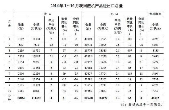 1~10月出口塑料机械设备总共500628台,出口金额约16.02亿美金,出口总数和金额各自同比增长57%、3%,顺差约4.89亿美金。