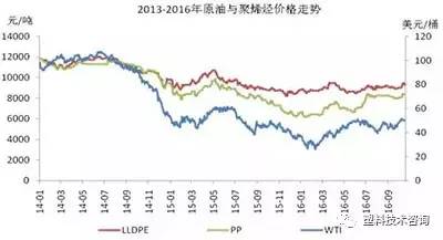 由图由此可见,2013-2014年石油价格处在上位,其市场价格与聚烯烃行情基础符合,2015年石油价格断崖式下跌后保持偏底位运作,聚烯烃盈利扩大,市场价格受石油价格危害变弱。