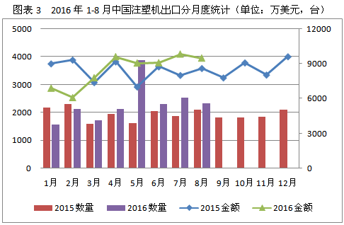 从图1能够看得出,2016年的1-8月,中国注塑机的進口金额和总数与2015同比增加都是有显著降低。