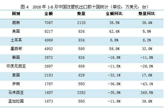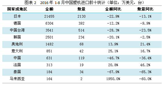 已有人阅读此文 - -2016年1-8月,中国注塑机進口3608台,同比减少15.8%,進口金额为37931万美金,同比减少21.5%;出口18588台,同比增长19.3%;出口金额为67822万美金,同比增长0.9%。