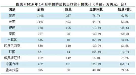 2016年1-4月,中国挤出机進口284台,同比增长1.8%;進口金额为15912万美金,同比增长35.4%;出口34378台,同比增长4.4%,出口金额为12714万美金,同比增长1019.8%。