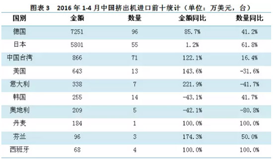 2016年1-4月在我国挤出机進口前十国统计分析