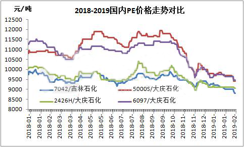 受制于高库存、低需求,2019年春节后聚乙烯行情迅速走低,华北地区线性8550-8800元/吨,高压8700-9000元/吨,低压除中空因资源少相对坚挺外,各产品均有不同程度下滑,拉丝主流8950-9400元/吨,注塑8450-8800元/吨,膜9400-9650元/吨,创下近年新低。下游加工企业一般在元宵节后陆续开工,库存消化极为缓慢。