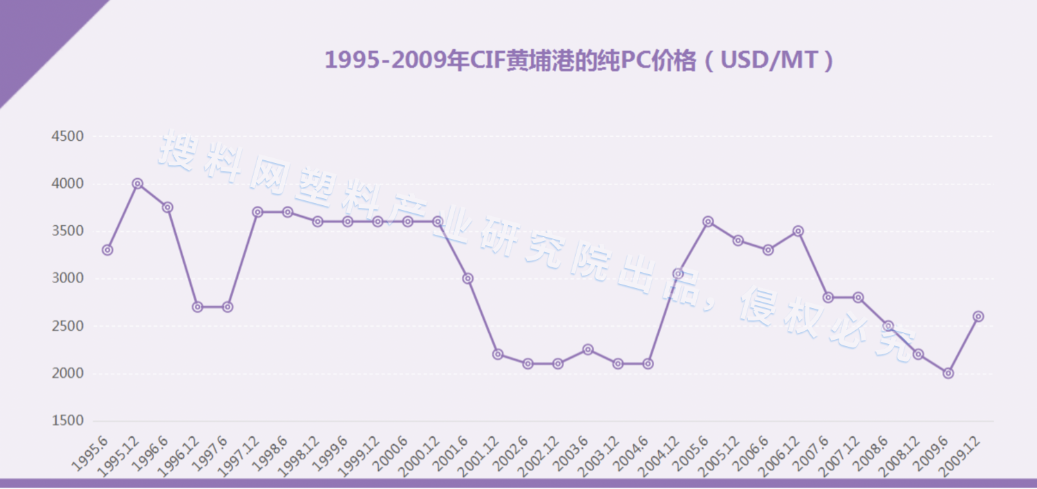 2005年,拜耳2805、GE141R在中国大陆含税最高接近40元/kg,与其相比,在经历了经济危机后,国内的PC市场售价在2009年年中,降到了最低含税不到18元/kg。