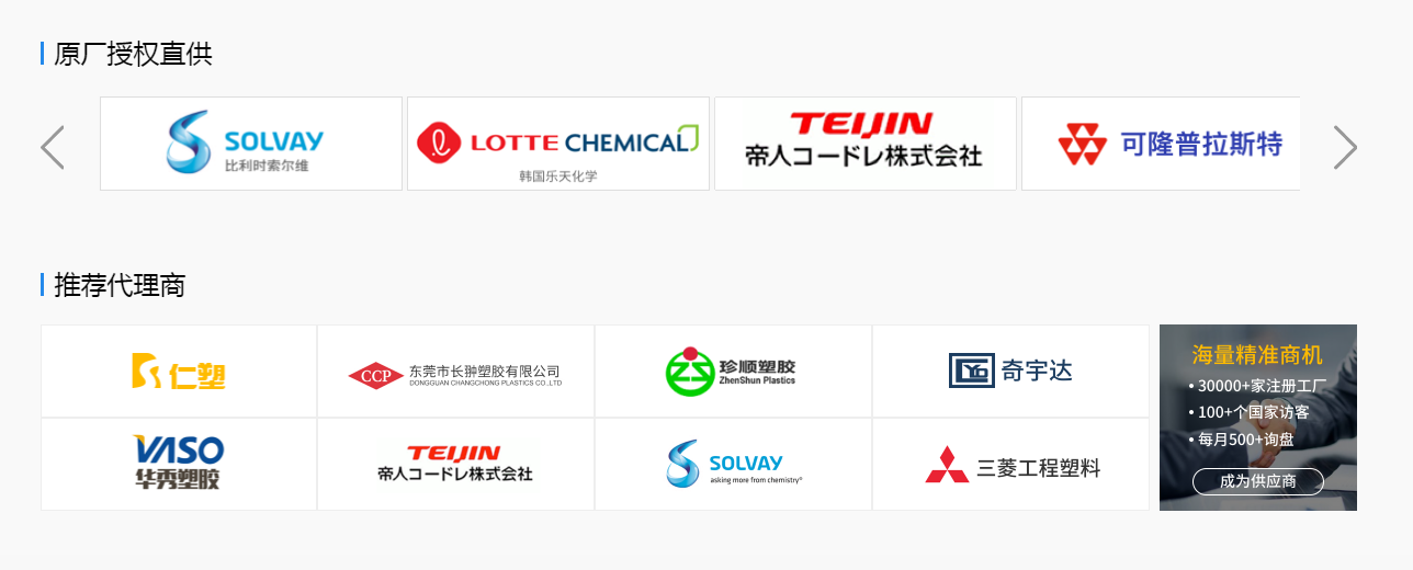 自2017年6月上线交易以来,搜料网凭借“只卖原厂真料”的经营理念,首先在工程塑料在线交易领域实现了5亿的营业收入,接受了超过2000万次的专业访问,获得了比亚迪、华为、小米等近3万家工厂的注册认可;大疆、鹏程、达孚、华中科技大学、东北大学、重庆大学等一大批行业知名企业及科研院所通过搜料自营进行采购,日本帝人、韩国乐天、德国巴斯夫等近20家国际一线品牌原厂的授权直供;平台沉淀了近500个一级代理商的资源;汇邦NCM(中国塑料化工分销黄埔军校)、众智(BASF华南最大代理)、源博/珍顺(LG化学核心代理商)、长翀(长春华南最大代理商)、仁塑(苯领代理商、PMMA专家)、奇宇达(奇美华南核心代理商)、华秀(SABIC华南重要代理商)、瑞海发(科慕氟塑料/SABIC/杜邦/LG代理商)、昊润(长春华东重要代理商)、昕纤(新光华南销售公司)、炬塑行(LG/乐天代理商)、善德宸信(SABIC华东代理商)、祥正(道默华东一级代理)等纷纷在搜料网开设官方旺铺。