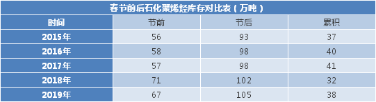 库存方面,据统计,春节期间国内聚烯烃石化库存累积38万吨左右,节后攀至105万吨高点,库存的骤增令商家担忧气氛增加,虽节后返市商家有限,但在供应端增加的压力下,出货均表现了不同程度上的让利。