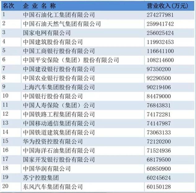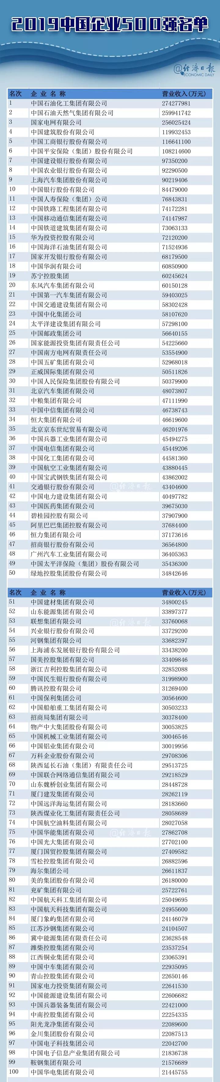 9月1日,中国企业联合会、中国企业家协会发布2019中国企业500强榜单,中石化、中石油、国家电网位居榜单前三。
