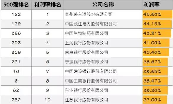 从各企业披露的数据信息来看,不出意料,茅台第一(45.6%利润率)。入榜的前10家企业,民营、非国有控股的企业更多。