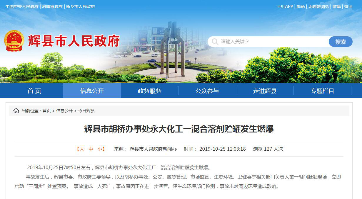 从河南辉县市政府网获悉,2019年10月25日7时50分左右,辉县市胡桥办事处永大化工厂一混合溶剂贮罐发生燃爆,事故造成一人死亡。