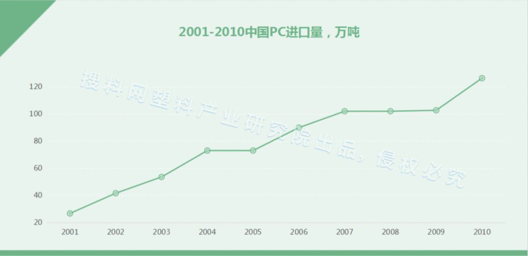 截止到2008年,国内自主产能仅约6000吨/年。早在2007年,中国的PC进口量已经达到102万吨!拜耳、陶氏、GE,三家公司占据了全球产能及市场份额的60%以上。
