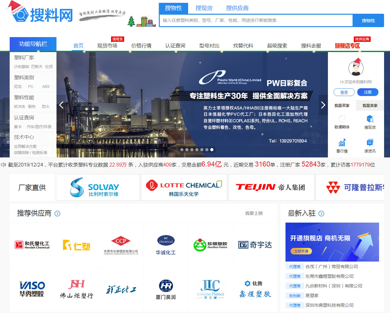 自2017年6月上线交易以来,搜料网凭借“只卖原厂真料”的经营理念,首先在工程塑料在线交易领域实现了5亿的营业收入,接受了超过2000万次的专业访问,获得了比亚迪、华为、小米等近3万家工厂的注册认可;大疆、鹏程、达孚、华中科技大学、东北大学、重庆大学等一大批行业知名企业及科研院所通过搜料自营进行采购,日本帝人、韩国乐天、德国巴斯夫等近20家国际一线品牌原厂的授权直供;平台沉淀了近500个一级代理商的资源;汇邦NCM(中国塑料化工分销黄埔军校)、众智(BASF华南最大代理)、源博/珍顺(LG化学核心代理商)、长翀(长春华南最大代理商)、仁塑(苯领代理商、PMMA专家)、奇宇达(奇美华南核心代理商)、华秀(SABIC华南重要代理商)、瑞海发(科慕氟塑料/SABIC/杜邦/LG代理商)、昊润(长春华东重要代理商)、昕纤(新光华南销售公司)、炬塑行(LG/乐天代理商)、善德宸信(SABIC华东代理商)、祥正(道默华东一级代理)等纷纷在搜料网开设官方旺铺。