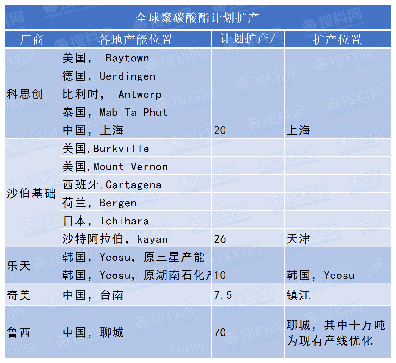 2018年初,万华一期7万吨年产能的PC装置正式投产。同年中,第二第三套装置开工,预计2019年全部建成,建成后,万华年PC产能可达20万吨。