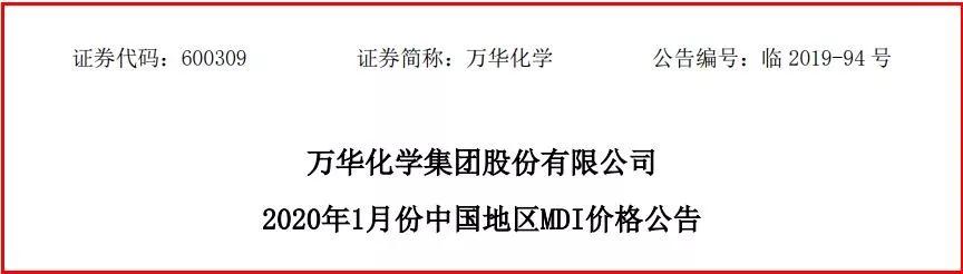 大幅降价!万华宣布2020年1月MDI价钱下调3300元/吨