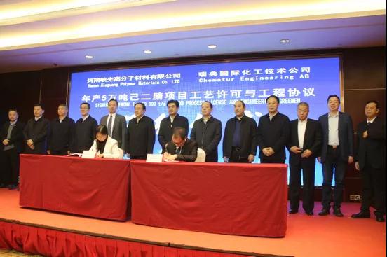 签约仪式上,瑞典国际化工技术公司与河南峡光高分子材料公司负责人分别介绍项目及企业情况,并签订了年产5万吨己二腈项目工艺许可与工程协议。