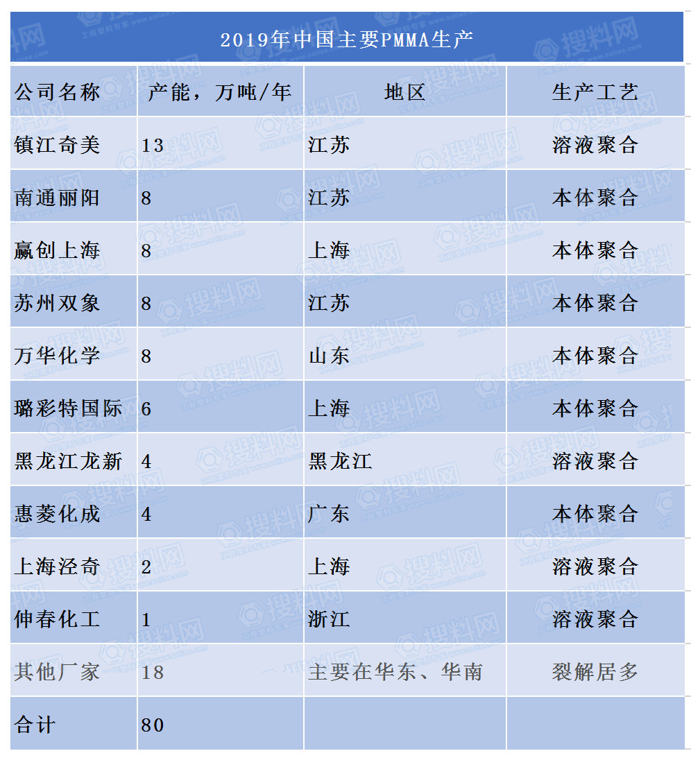 2019年,国内PMMA生产企业总共有300多家,产能合计约80万吨/年。