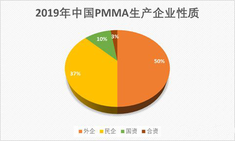 我国PMMA行业起步较晚,因此外商独资企业是我国PMMA主要生产商,市场占比50%,如果不考虑裂解PMMA生产企业的产能,那么外企占比会达到65%,国内的PMMA生产企业还有很大的提升空间,前景可期!