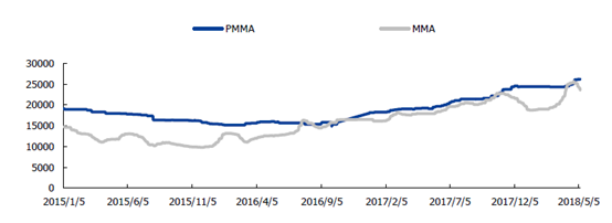 ▲PMMA 及MMA 历史价格走势(元/吨)