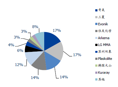 从全球产能分布来看,PMMA 的生产大部分集中于三菱、住友及奇美等海外化工巨头手中,市场合计占有率达到60~70%的水平。