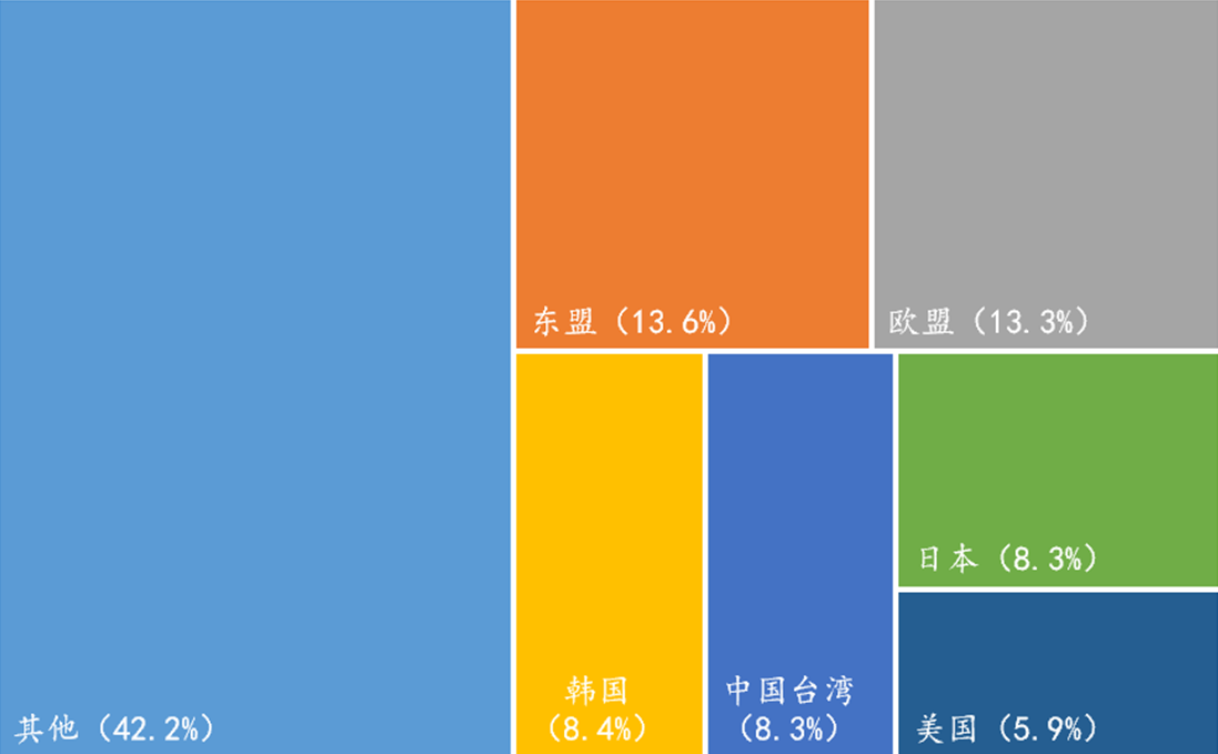 进口角度,2019年我国全年进口金额20771.0亿美元,其中自日本进口比重达到8.3%,仅次于东盟(13.6%)、欧盟(13.3%)和韩国(8.4%)。
