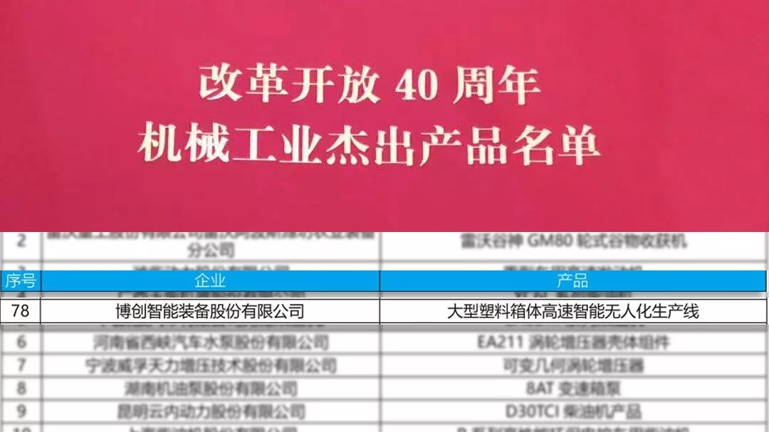今年初,中机联党委下发了关于做好机械行业庆祝改革开放40周年系列活动的通知,其中改革开放40周年―机械工业杰出产品选树活动,得到了行业广泛响应。博创智能装备股份有限公司的“大型塑料箱体高速智能无人化生产线”项目经行业组织推荐、征集办公室和有关专家初审、专业协会复审、专家评审会再评审、中机联会长办公室确定等流程后,从330项申报项目中脱颖而出,成功入选《改革开放40周年机械工业杰出产品名单》。博创将不忘初心,不断创新,为塑机行业添砖加瓦。