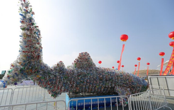 2018年7月21日,山东日照由40000个废旧塑料瓶组成的鲨鱼造型艺术品亮相日照海洋公园开园仪式。