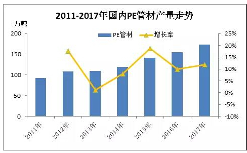 通过2006-2017年中国塑料管道产量走势图来看,国内塑料管道产量维持稳定增长,且2014年,住建部提出海绵城市建设,2015年和2016年,国家有关部委分别确定16个城市及14个城市进行海绵城市建设先行试点工作,随着海绵城市逐步推广,截至目前,生态城已启动65个海绵城市试点项目建设,海绵城市的建设大力拉动了国内排水管的使用。另外,在2017年国内环保政策下“煤改气“的提出及实行,对PE管材的需求更是推进了一步。