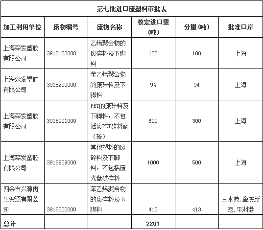 而这两个企业获批的进口废塑料类型也不局限于一种,上海森发塑胶有限公司乙烯聚合物的废碎料及下脚料核定进口量100吨、苯乙烯聚合物的废碎料及下脚料核定进口量94吨、PET的废碎料及下脚料,不包括废PET饮料瓶(砖)核定进口量600吨、其他塑料的废碎料及下脚料,不包括废光盘破碎料核定进口量1000吨。