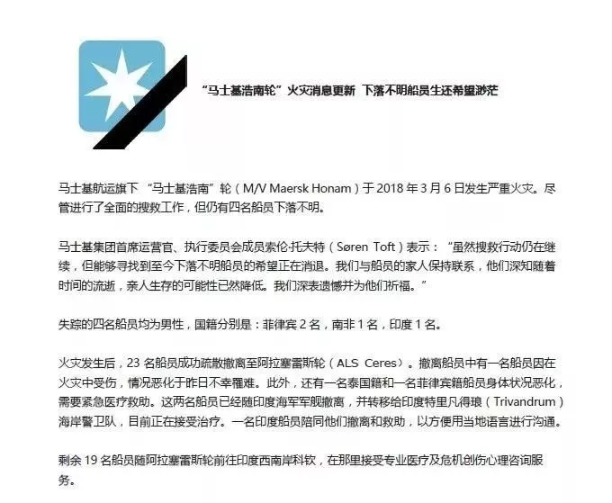 2018年3月6日 周二,当地时间15点20分,马士基旗下运力高达15262 Teu 的集装箱船 (Maersk Honam)发生严重火灾,23名船员已安全转移,1名船员不幸遇难,仍有4名船员生死未卜!!