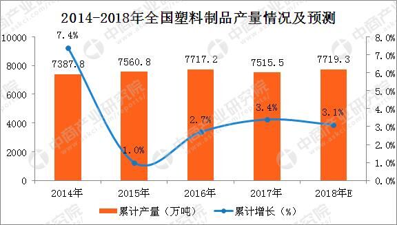 据中商产业研究院发布的《2018-2023年中国塑料制品行业市场前景及投资机会研究报告》数据统计显示,自2015年来,中国塑料制品累计产量保持稳定增长的趋势,年产量基本保持在7000-8000万吨。具体来看,2017年中国塑料制品累计产量为7515.5万吨,累计增长3.4%。据中商产业研究院数据预测,预计2018年中国塑料制品累计产量将达7719.3万吨,累计增长约3.1%。
