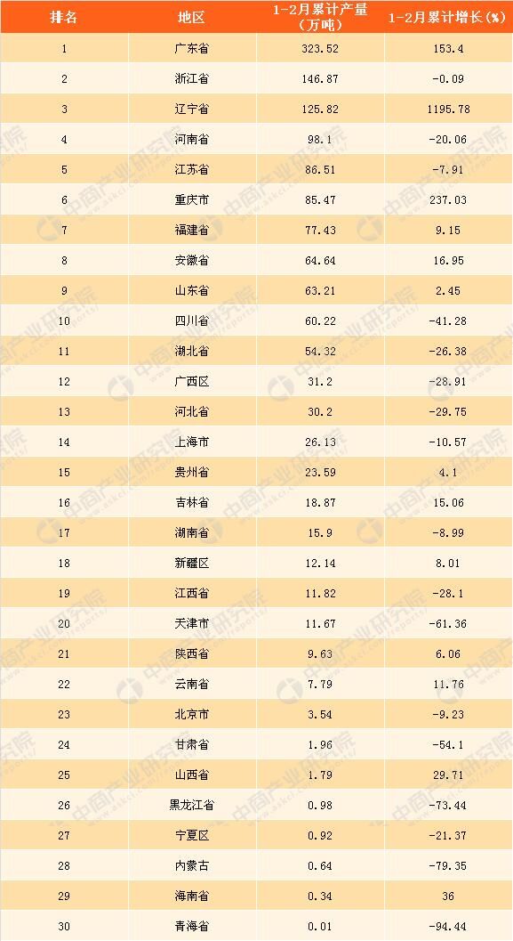 2018年1-2月全国各省市塑料制品产量排行榜