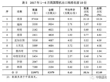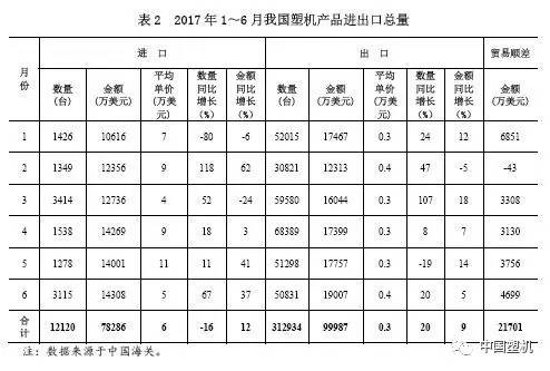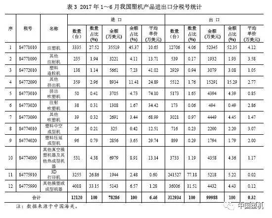 进出口层面,2017年1~6月塑机顺差约2.17亿美金。进口塑料机械设备12120台,进口金额约7.83亿美金,进口总数同比下降16%、金额同比增长12%,进口均值价格由上年同期的5万美元/台提高至六万美金/台。出口塑料机械设备312934台,出口金额约10亿美金,出口总数同比增长20%、金额同比增长9%,出口均值价格0.三万美金/台。在其中,注塑机、挤塑机、吹塑机、中空成型机和压延成型机的出口总产量为31668台,出口金额近8.六亿美金,出口均值价格约三万美金/台。