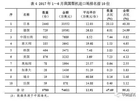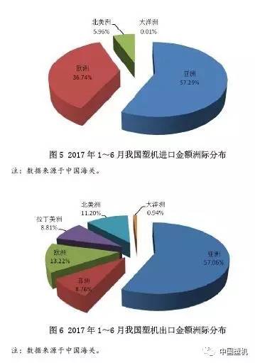 进口来源于地层面,2017年1~6月从亚洲地区进口塑机9974台,金额约4.48亿美金,各自占当期进口塑机的82.31%、57.29%,在其中从日本进口总数和金额各自同比增长37.78%、17.04%;从日本进口总数和金额各自同比增长50.65%、18.65%。