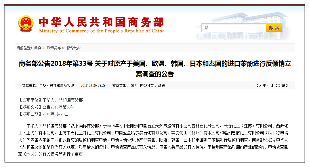 商务部决定自2018年3月26日起对原产于美国、欧盟、韩国、日本和泰国的进口苯酚进行反倾销立案调查。