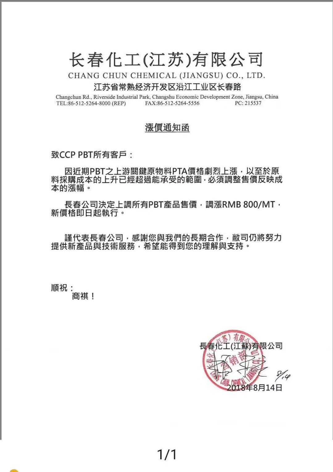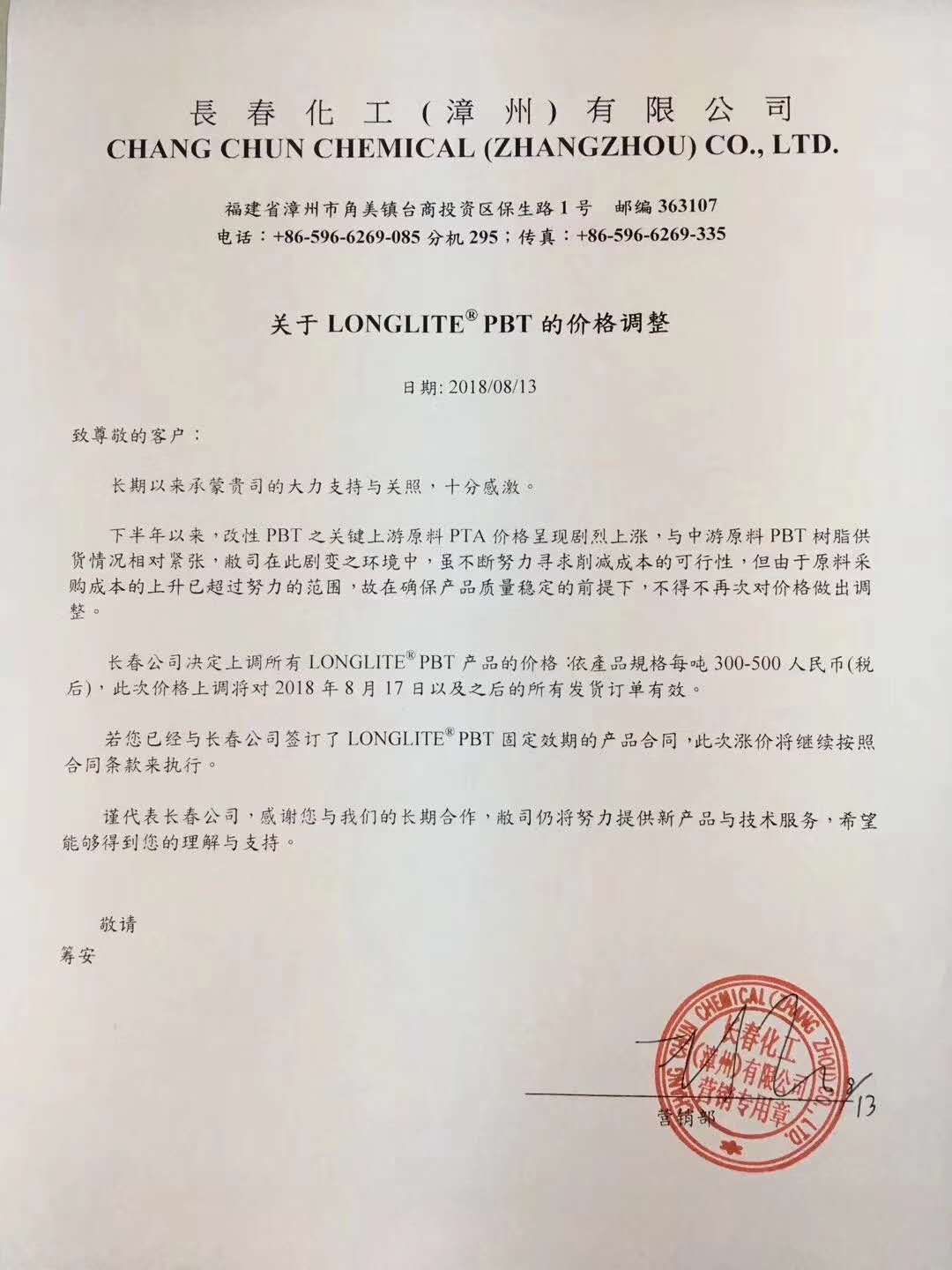 2018年8月17日起,长春上调所有LONGLITE® PBT产品的价格,按产品规格每吨300~500人民币(税后)执行。