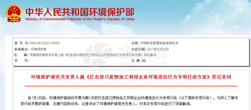近些年的自然环境稽查检查发觉,一些进口废物生产加工利用公司规模小、环境污染比较严重,环保治理设备异常运作等自然环境违纪行为比较突显,提升了地区空气污染负载,也给某些地域导致了比较严重空气污染。4月18日,中间全方位改革创新领导组第三十四次会议决议根据了《关于禁止洋垃圾入境推进固体废物进口管理制度改革实施方案》。为贯彻执行中间决策部署,切合人民大众对优良生态环境保护的新规定和新希望。环境保护部在项目前期的基本上,决策进行历时一个月的专项行动,严厉打击进口废物生产加工利用公司的自然环境违纪行为。