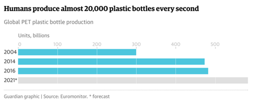 (每秒就会有两万个塑料瓶被生产制造出去。图:Guardian graphic)