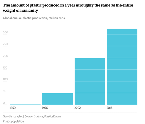 (2015年一年新生产制造的塑料等于70亿人的休重之和。图:Guardian graphic)