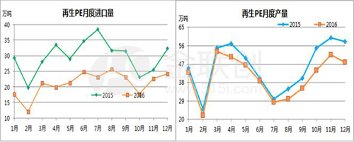 在环境保护飓风下,迫不得已提便是塑料再生料,大家说白了的再生料,现阶段中国中下游公司中,尤其是中小企业,为了更好地减少产品成本扩张盈利,依据不一样层级商品规定在其生产制造原材料里加上一定占比的再生料,做到其商品达标盈利丰厚的理性化,从图上看,与2015年对比,2016年PE生产量及出口量降低显著,尤其是出口量减幅很大,预估2017年减幅将远远地超出2016年,在环境保护全力惩处下,再生料供货将再次降低。