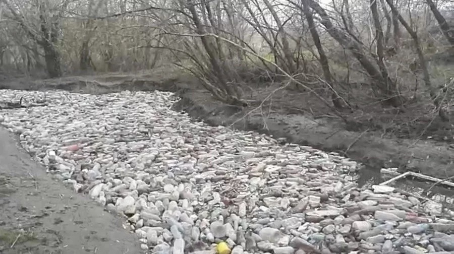 俄罗斯巴尔瑙尔的Pivovarka河河面飘着数千塑料瓶