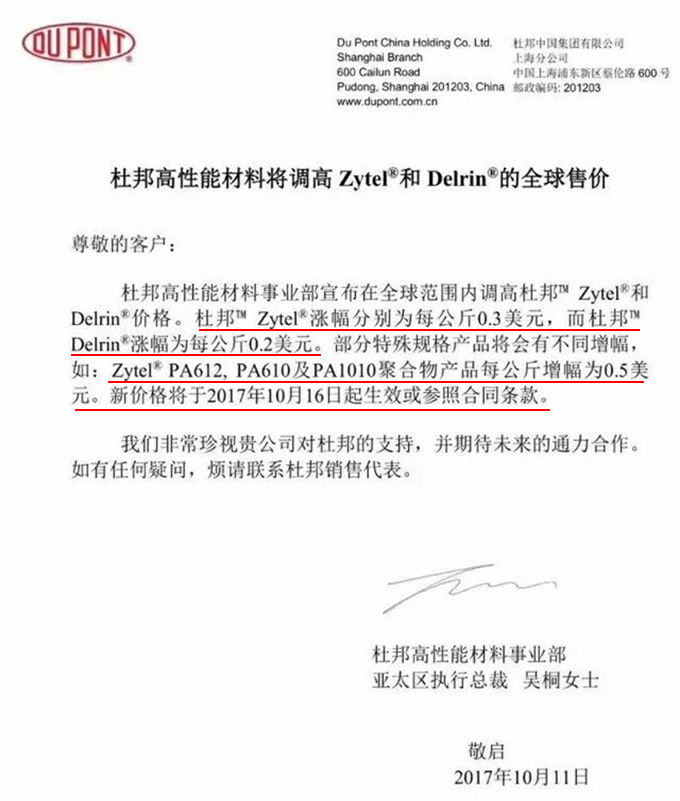 8月中旬,杜邦再发涨价函,宣布上调杜邦DuPont Rynite改性聚对苯二甲酸乙二醇酯(PET)价格,调整如下: 2018年9月1日起, 杜邦Rynite系列产品 价格上调 300美元/吨(折合人民币2074元/吨)...
