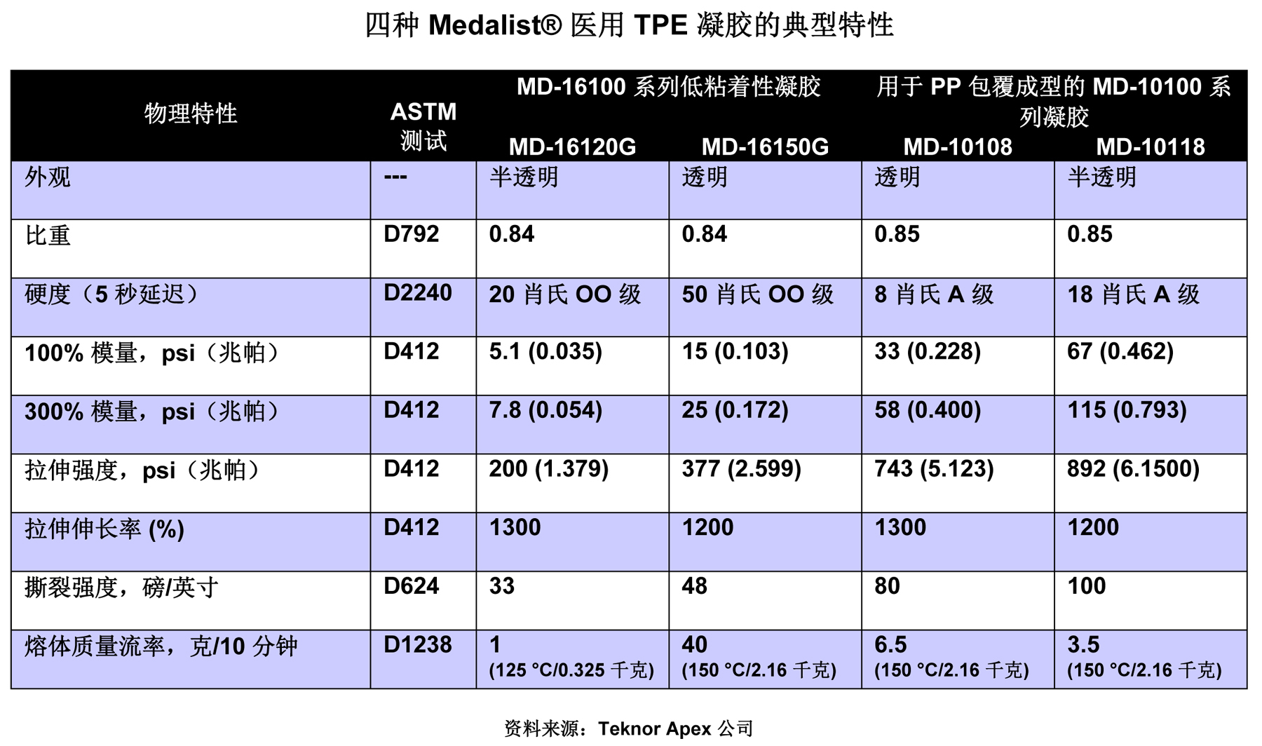 Teknor Apex 生产制造的 Medalist® MD-16100 和 10100 系列产品 TPE 摆脱了规范凝胶的限定,为医疗器械生产商提供了经济发展高效率的硅橡胶代替品