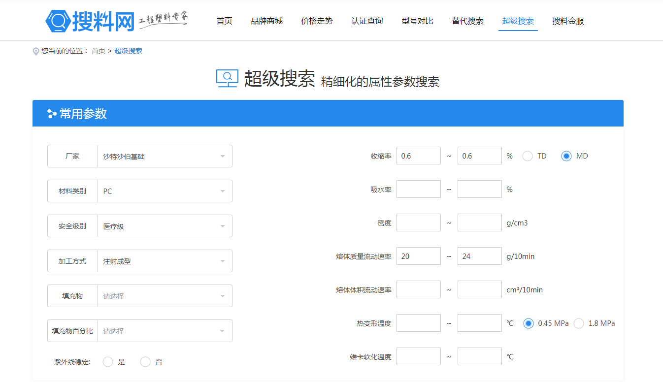 2018年12月28日,搜料上超级搜索2.0新版上线,搜料网的超级搜索1.0自从上线以来一直受到用户的热捧。特别是产品开发的工程师,对超级搜索给予了十分的好评。新版上线的超级搜索2.0,除了常规的塑料类别厂家筛选外,还有收缩率,吸水率,热变形温度,折射率,介电强度,拉伸强度,阻燃性能等数十个维度的精细化搜索。