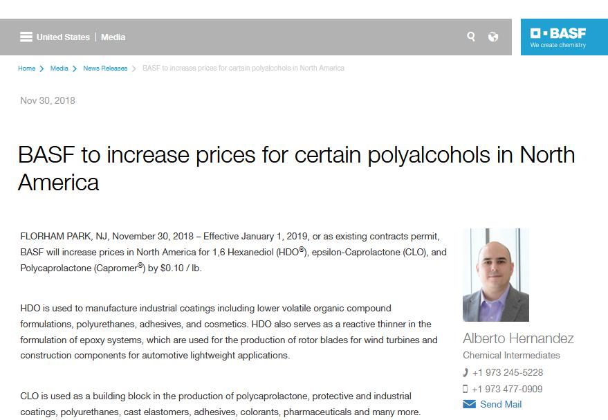 巴斯夫宣布在2019年继续提高价格,以应对原材料成本上涨的影响。公司对北美地区的1,6己二醇(HDO)、己内酯(CLO)和聚己内酯(Capromer)的价格提高0.1美元/磅。涨价于2019年1月1日生效。