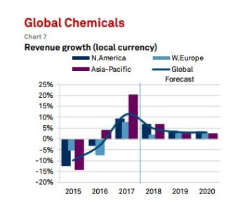 在产能方面,根据statista机构的预测,2019年,北美化工产品产能将录得3.3%的增长;拉丁美洲则有2.9%的增长;亚太区的增幅为5.1%,与2018年持平。
