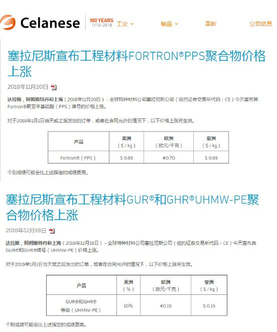全球特种材料公司塞拉尼斯公司宣布于2019年1月1日起,或依据合同条款对GUR®和GHR®牌号(UHMW-PE)价格实施涨价。