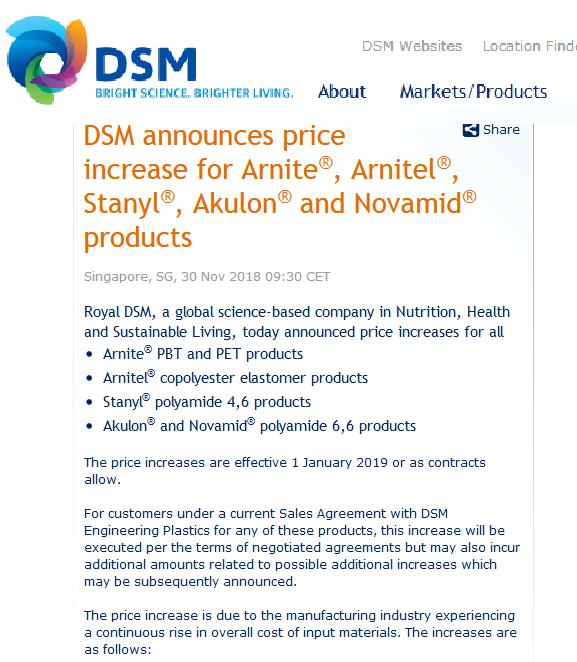 帝斯曼:针对PBT、PET、PA66等多个品牌的产品提价