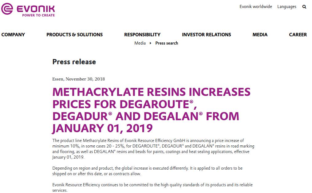 德国赢创公司(Evonik)宣布,于2019年1月1日起开始调高其甲基丙烯酸树脂产品系列价格,涨幅至少10%,部分产品涨幅达到20%—25%。